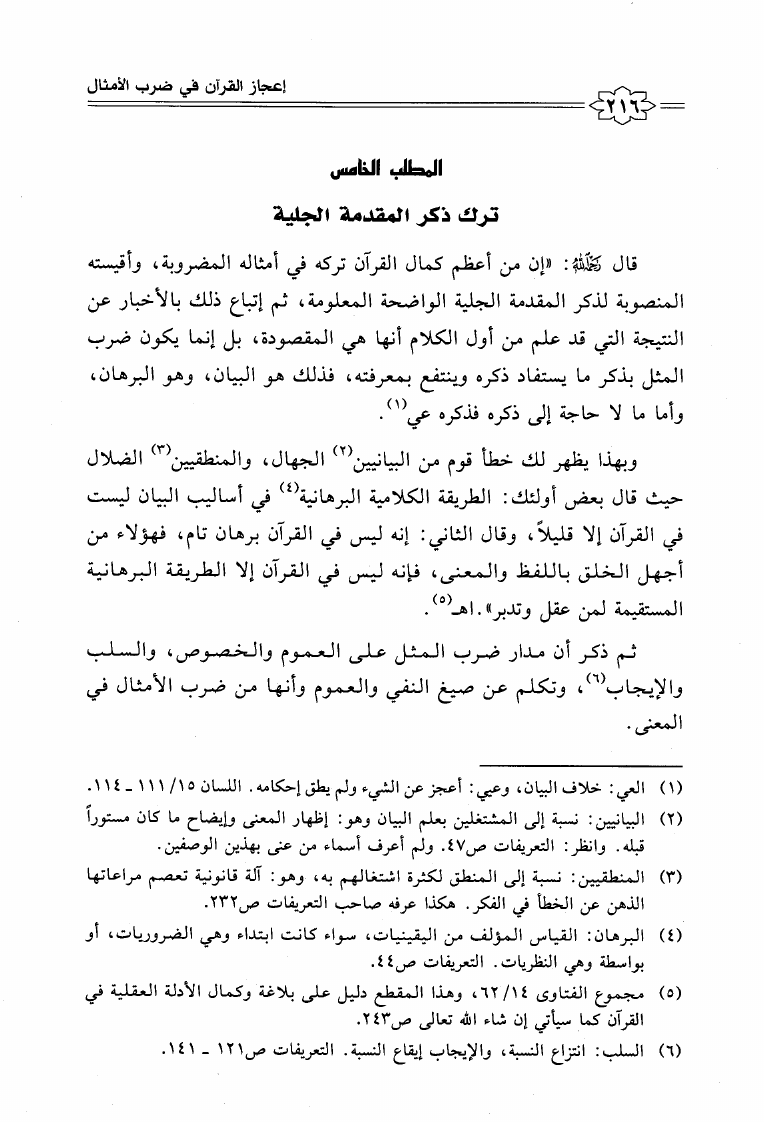 نام کتاب : إعجاز القرآن الكريم عند شيخ الإسلام ابن تيمية مع المقارنة بكتاب إعجاز القرآن للباقلاني نویسنده : محمد بن عبد العزيز العواجي جلد : 1 صفحه : 216