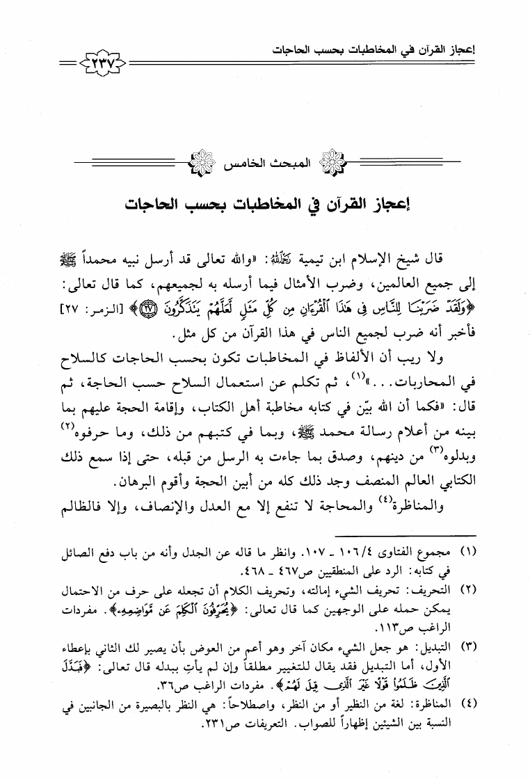 نام کتاب : إعجاز القرآن الكريم عند شيخ الإسلام ابن تيمية مع المقارنة بكتاب إعجاز القرآن للباقلاني نویسنده : محمد بن عبد العزيز العواجي جلد : 1 صفحه : 237