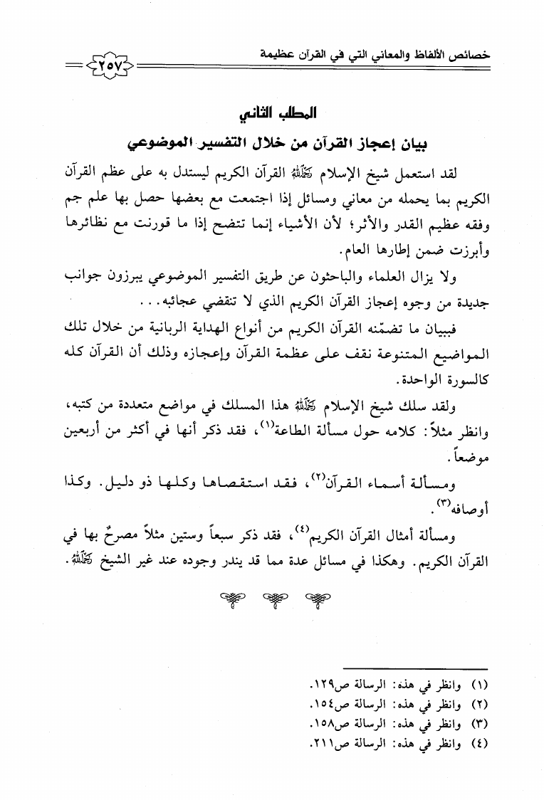 نام کتاب : إعجاز القرآن الكريم عند شيخ الإسلام ابن تيمية مع المقارنة بكتاب إعجاز القرآن للباقلاني نویسنده : محمد بن عبد العزيز العواجي جلد : 1 صفحه : 257