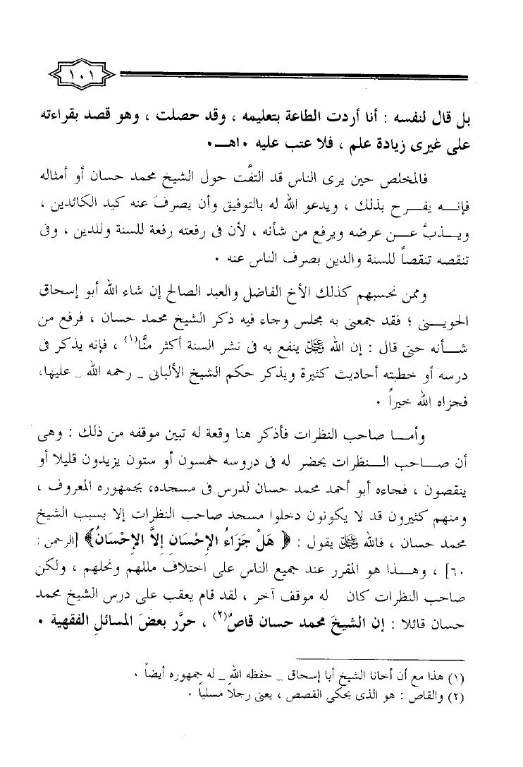 نام کتاب : الإنتصار للحق وأهل العلم الكبار والرد على من رمى الشيخ محمد ناصر الدين الألباني رحمه الله بالتساهل نویسنده : أحمد بن إبراهيم أبو العينين جلد : 1 صفحه : 101