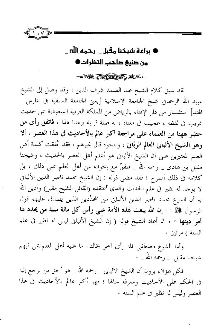 نام کتاب : الإنتصار للحق وأهل العلم الكبار والرد على من رمى الشيخ محمد ناصر الدين الألباني رحمه الله بالتساهل نویسنده : أحمد بن إبراهيم أبو العينين جلد : 1 صفحه : 107