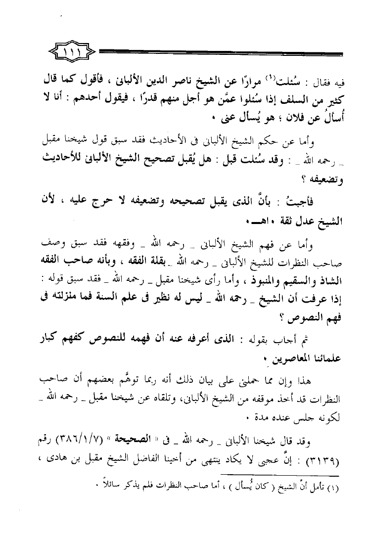 نام کتاب : الإنتصار للحق وأهل العلم الكبار والرد على من رمى الشيخ محمد ناصر الدين الألباني رحمه الله بالتساهل نویسنده : أحمد بن إبراهيم أبو العينين جلد : 1 صفحه : 111
