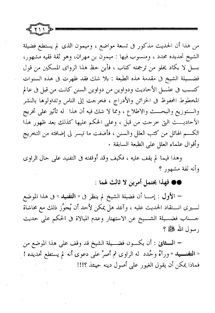 نام کتاب : الإنتصار للحق وأهل العلم الكبار والرد على من رمى الشيخ محمد ناصر الدين الألباني رحمه الله بالتساهل نویسنده : أحمد بن إبراهيم أبو العينين جلد : 1 صفحه : 211