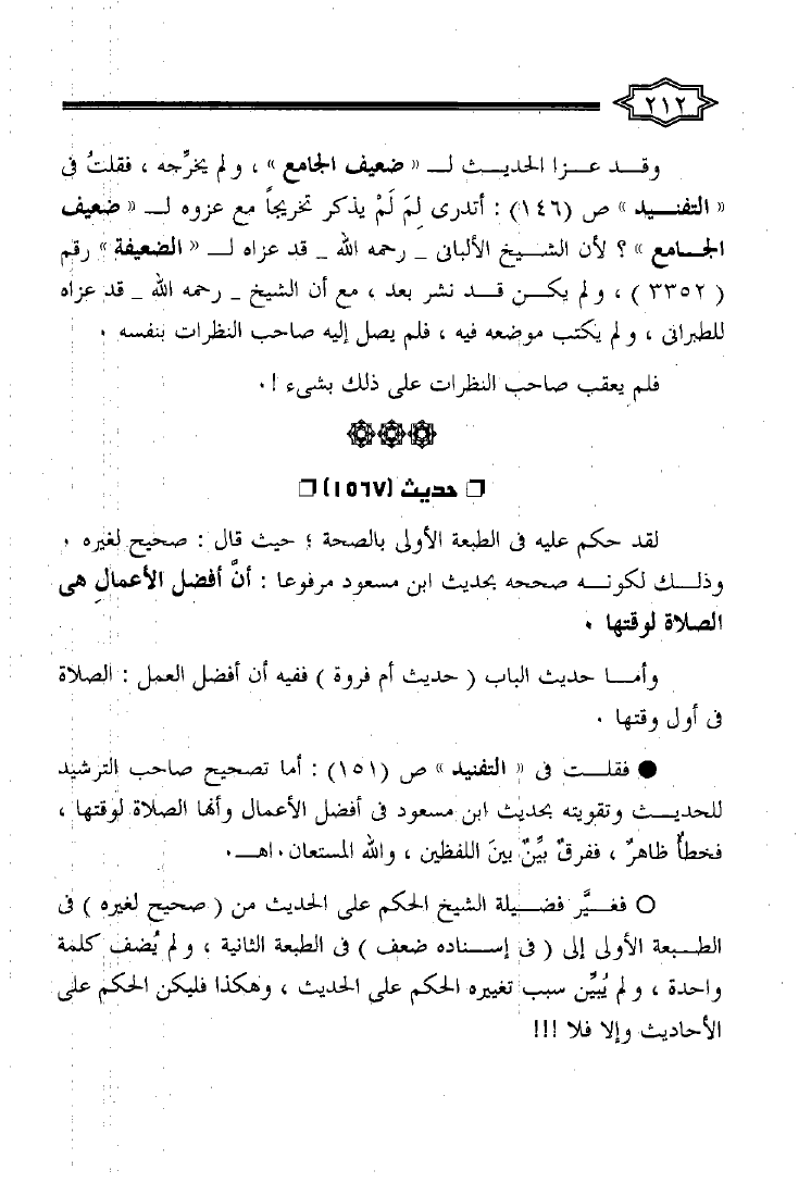 نام کتاب : الإنتصار للحق وأهل العلم الكبار والرد على من رمى الشيخ محمد ناصر الدين الألباني رحمه الله بالتساهل نویسنده : أحمد بن إبراهيم أبو العينين جلد : 1 صفحه : 212