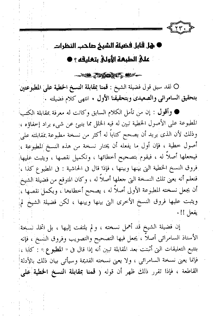 نام کتاب : الإنتصار للحق وأهل العلم الكبار والرد على من رمى الشيخ محمد ناصر الدين الألباني رحمه الله بالتساهل نویسنده : أحمد بن إبراهيم أبو العينين جلد : 1 صفحه : 230