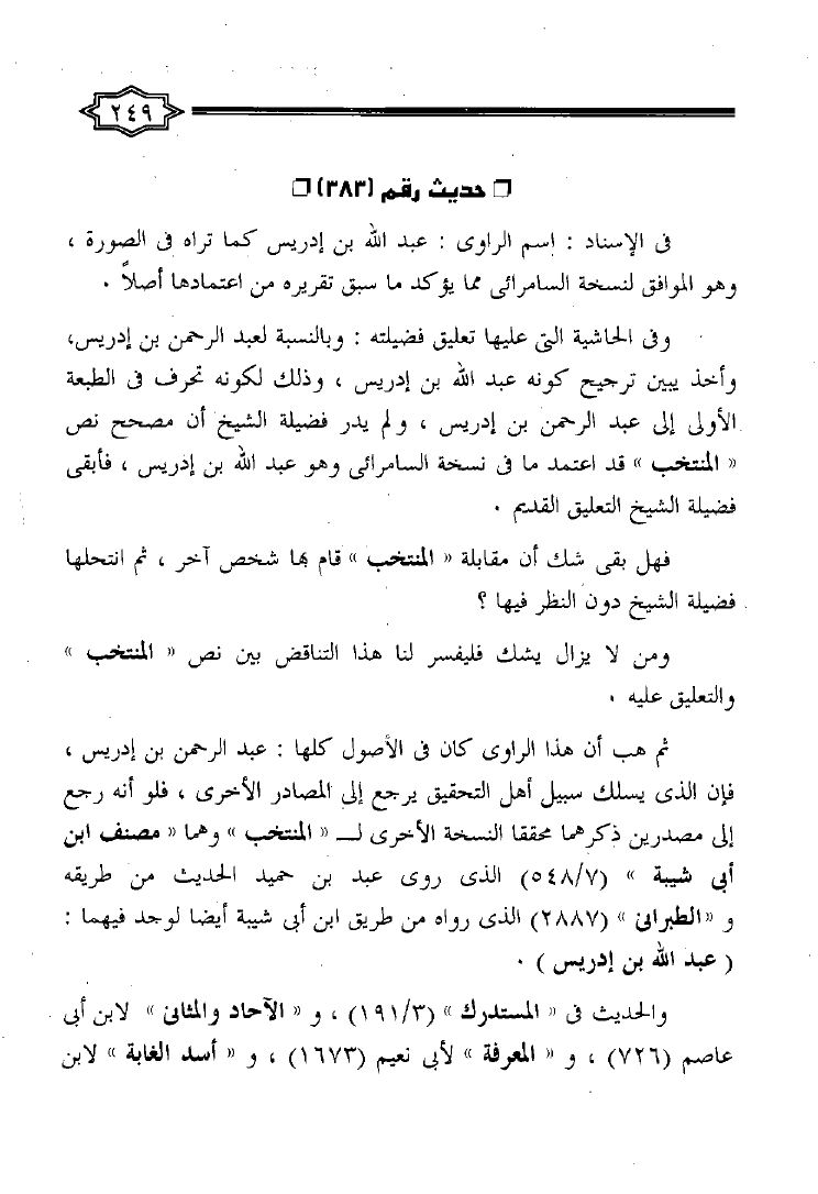 نام کتاب : الإنتصار للحق وأهل العلم الكبار والرد على من رمى الشيخ محمد ناصر الدين الألباني رحمه الله بالتساهل نویسنده : أحمد بن إبراهيم أبو العينين جلد : 1 صفحه : 249