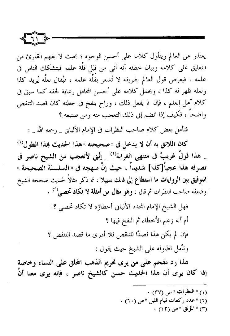 نام کتاب : الإنتصار للحق وأهل العلم الكبار والرد على من رمى الشيخ محمد ناصر الدين الألباني رحمه الله بالتساهل نویسنده : أحمد بن إبراهيم أبو العينين جلد : 1 صفحه : 61