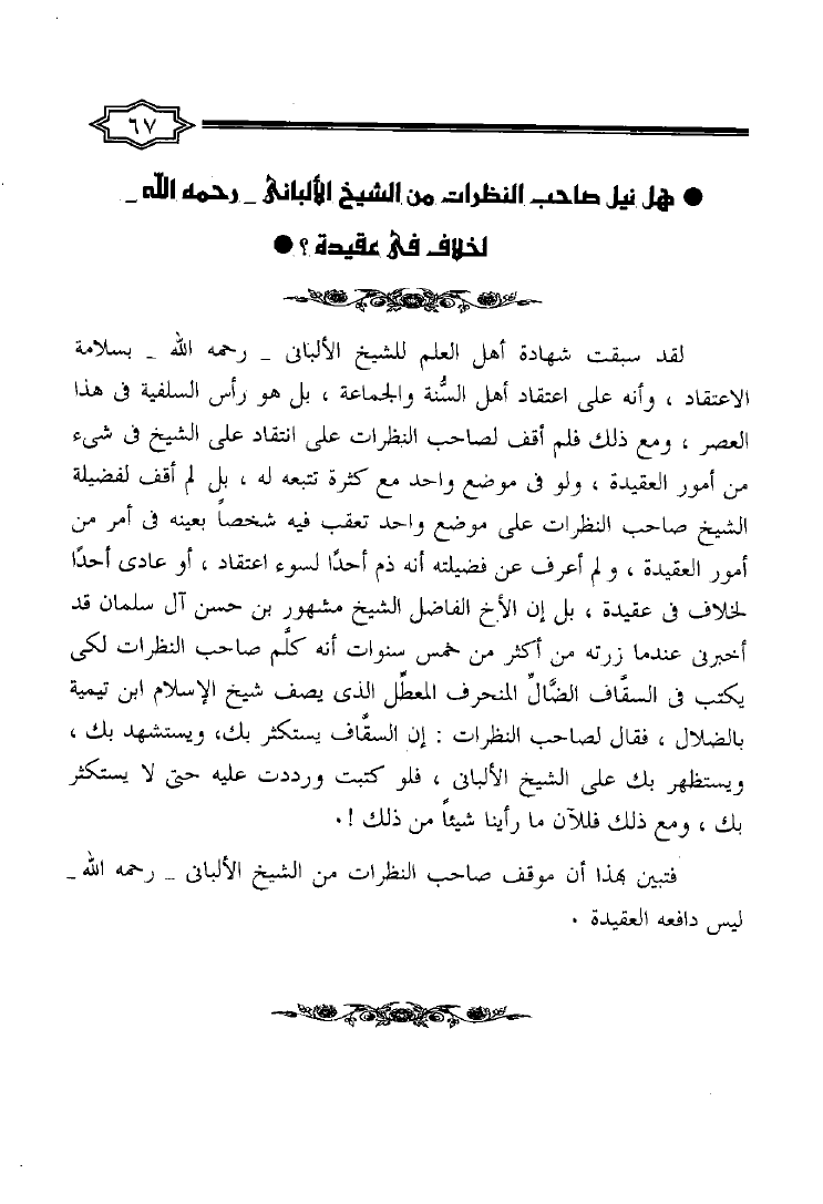 نام کتاب : الإنتصار للحق وأهل العلم الكبار والرد على من رمى الشيخ محمد ناصر الدين الألباني رحمه الله بالتساهل نویسنده : أحمد بن إبراهيم أبو العينين جلد : 1 صفحه : 67