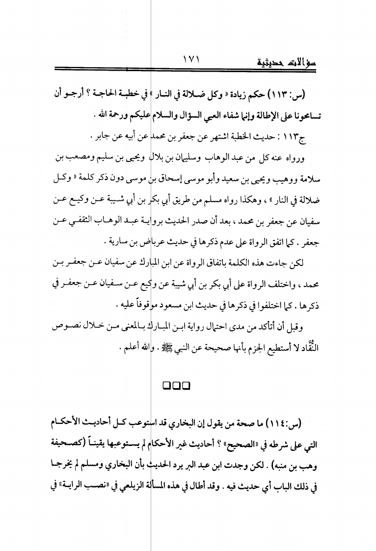 نام کتاب : سؤالات حديثية ويليه ملحقان حوار حول أثر الجرح والتعديل في التصحيح والتضعيق والثاني الرد على من انكر التباين المنهجي بين المتقدمين والمتأخرين في التصحيح والتعليل نویسنده : حمزة عبد الله المليباري جلد : 1 صفحه : 171