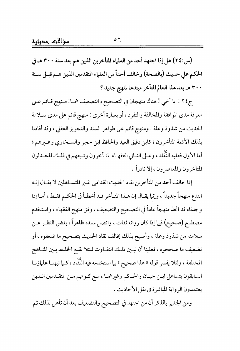 نام کتاب : سؤالات حديثية ويليه ملحقان حوار حول أثر الجرح والتعديل في التصحيح والتضعيق والثاني الرد على من انكر التباين المنهجي بين المتقدمين والمتأخرين في التصحيح والتعليل نویسنده : حمزة عبد الله المليباري جلد : 1 صفحه : 56