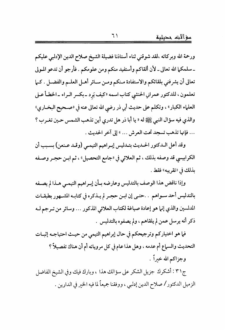 نام کتاب : سؤالات حديثية ويليه ملحقان حوار حول أثر الجرح والتعديل في التصحيح والتضعيق والثاني الرد على من انكر التباين المنهجي بين المتقدمين والمتأخرين في التصحيح والتعليل نویسنده : حمزة عبد الله المليباري جلد : 1 صفحه : 61