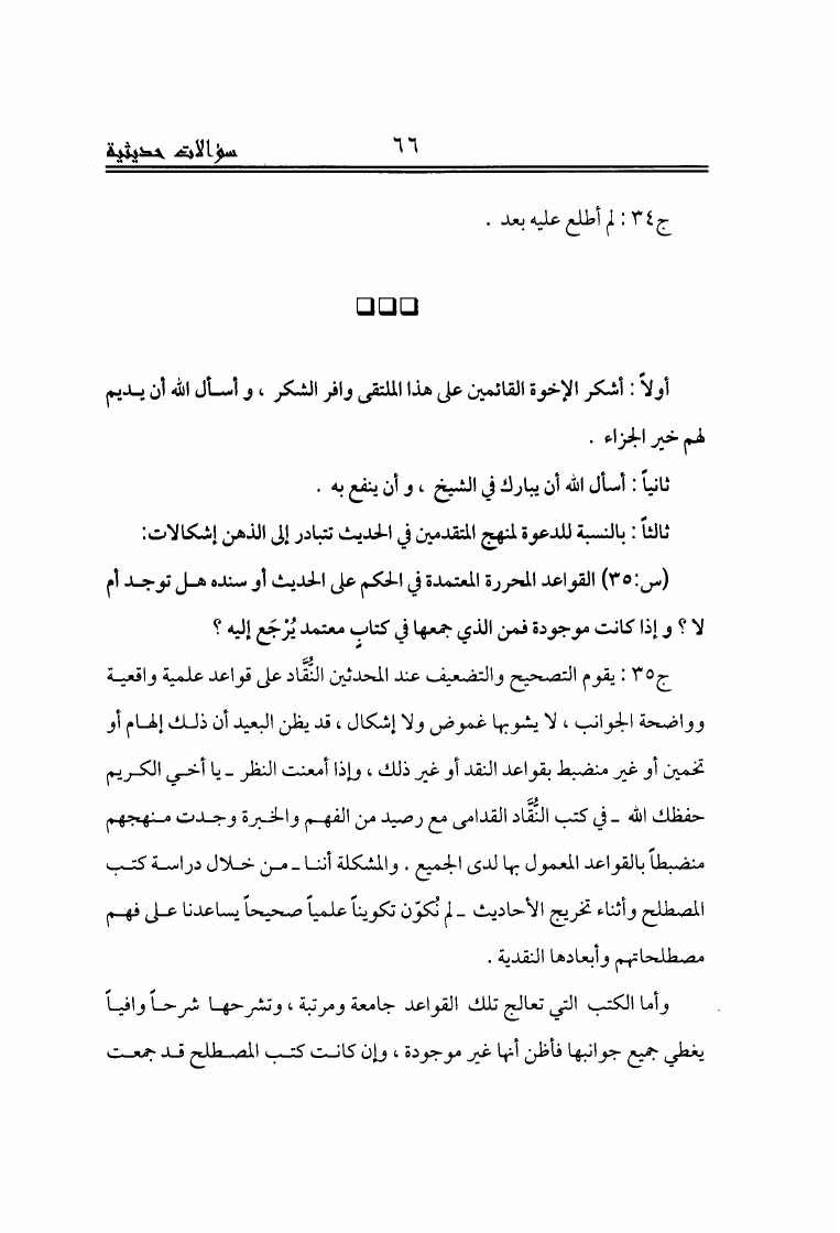نام کتاب : سؤالات حديثية ويليه ملحقان حوار حول أثر الجرح والتعديل في التصحيح والتضعيق والثاني الرد على من انكر التباين المنهجي بين المتقدمين والمتأخرين في التصحيح والتعليل نویسنده : حمزة عبد الله المليباري جلد : 1 صفحه : 66