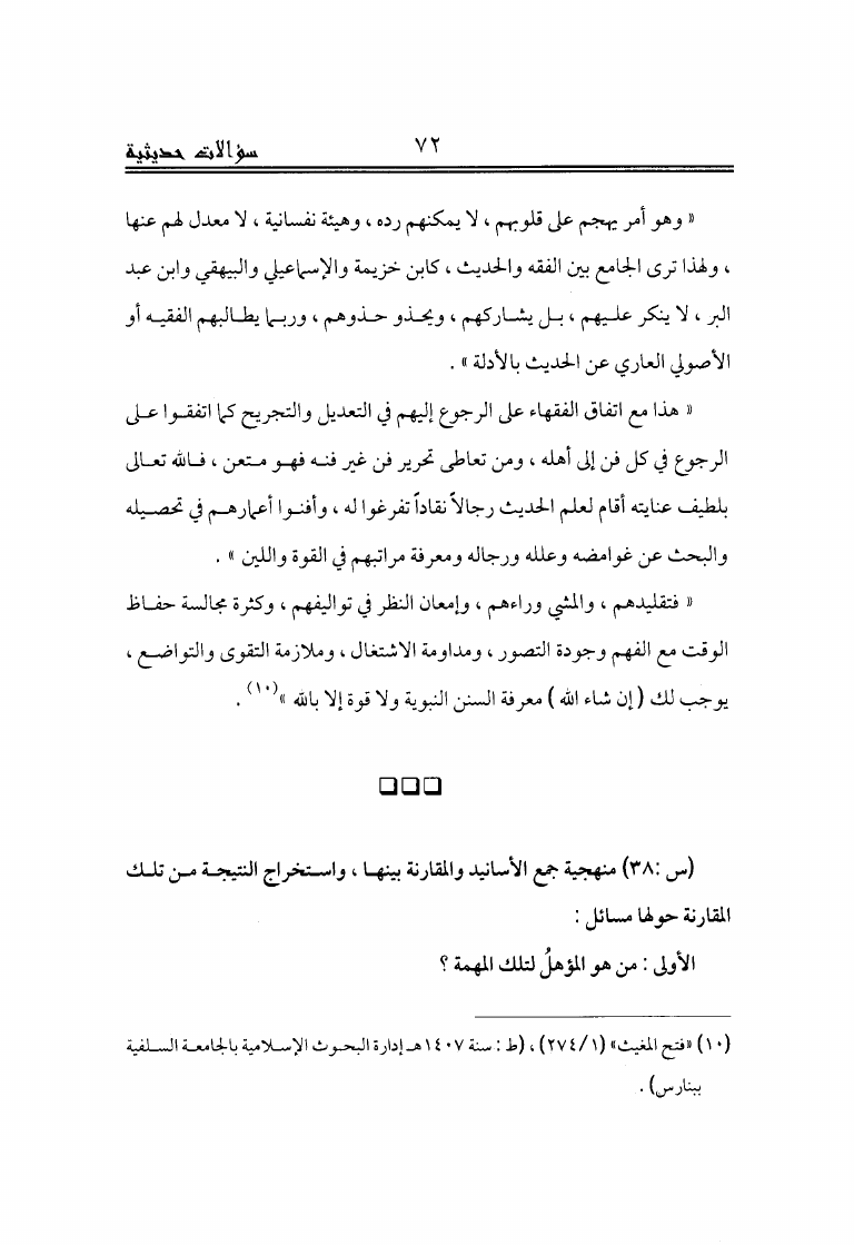 نام کتاب : سؤالات حديثية ويليه ملحقان حوار حول أثر الجرح والتعديل في التصحيح والتضعيق والثاني الرد على من انكر التباين المنهجي بين المتقدمين والمتأخرين في التصحيح والتعليل نویسنده : حمزة عبد الله المليباري جلد : 1 صفحه : 72