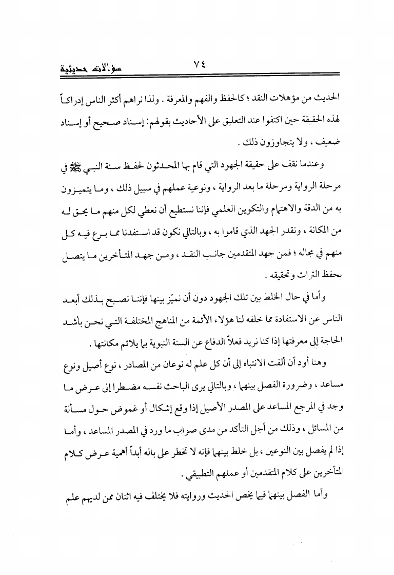 نام کتاب : سؤالات حديثية ويليه ملحقان حوار حول أثر الجرح والتعديل في التصحيح والتضعيق والثاني الرد على من انكر التباين المنهجي بين المتقدمين والمتأخرين في التصحيح والتعليل نویسنده : حمزة عبد الله المليباري جلد : 1 صفحه : 74