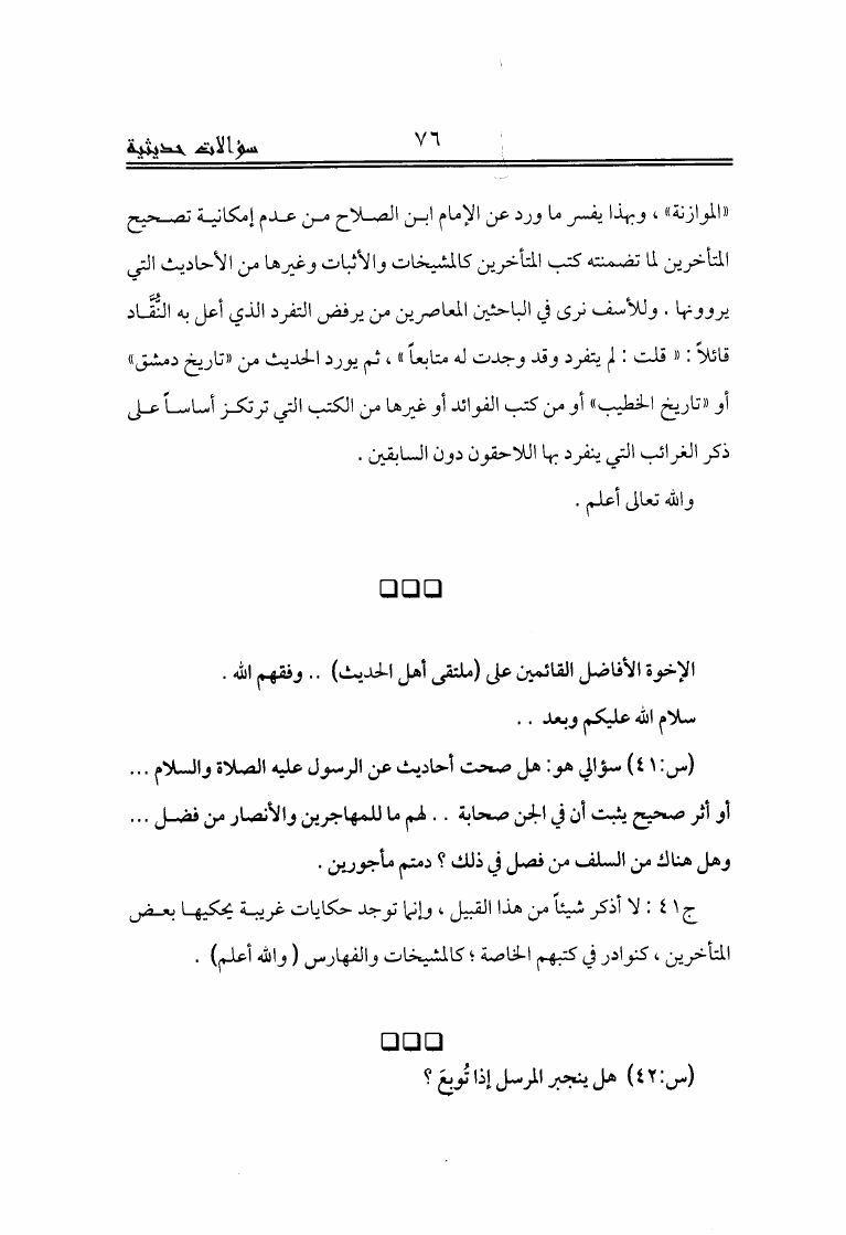نام کتاب : سؤالات حديثية ويليه ملحقان حوار حول أثر الجرح والتعديل في التصحيح والتضعيق والثاني الرد على من انكر التباين المنهجي بين المتقدمين والمتأخرين في التصحيح والتعليل نویسنده : حمزة عبد الله المليباري جلد : 1 صفحه : 76