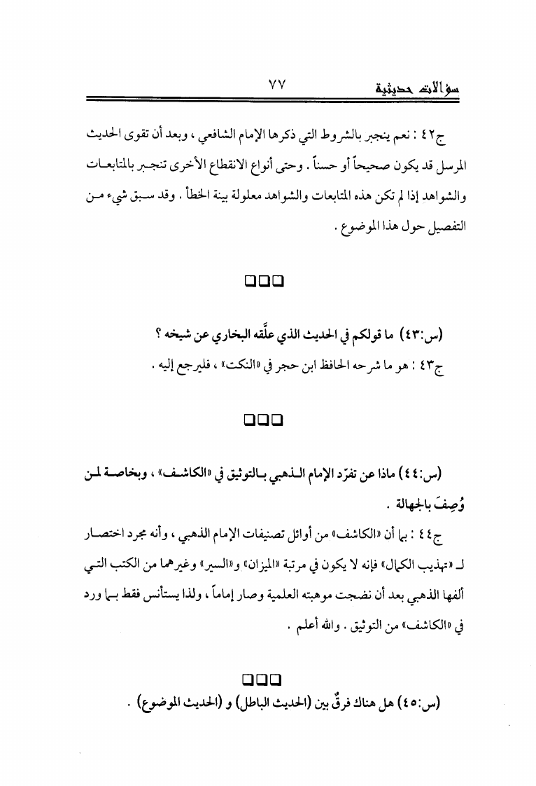 نام کتاب : سؤالات حديثية ويليه ملحقان حوار حول أثر الجرح والتعديل في التصحيح والتضعيق والثاني الرد على من انكر التباين المنهجي بين المتقدمين والمتأخرين في التصحيح والتعليل نویسنده : حمزة عبد الله المليباري جلد : 1 صفحه : 77