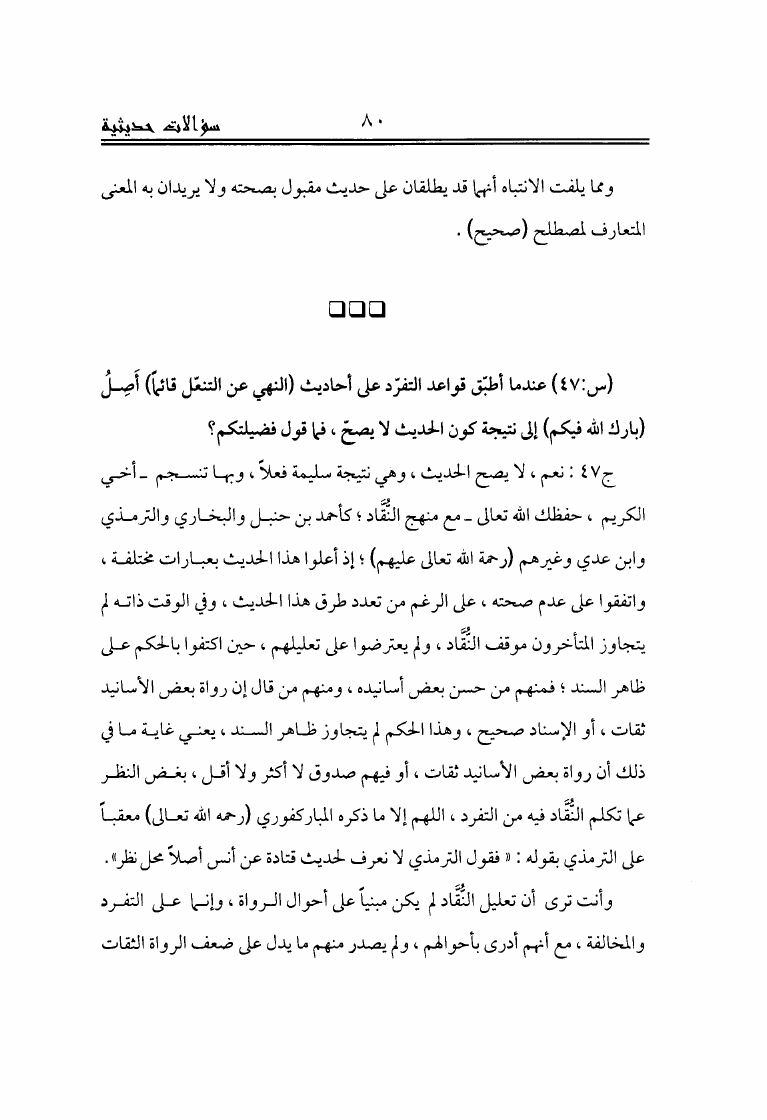 نام کتاب : سؤالات حديثية ويليه ملحقان حوار حول أثر الجرح والتعديل في التصحيح والتضعيق والثاني الرد على من انكر التباين المنهجي بين المتقدمين والمتأخرين في التصحيح والتعليل نویسنده : حمزة عبد الله المليباري جلد : 1 صفحه : 80