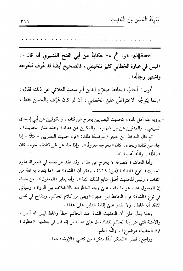 نام کتاب : علوم الحديث لابن الصلاح ونكت الحافظ العراقي المسماة بالتقييد والإيضاح لما أطلق وأغلق من كتاب ابن الصلاح ونكت الحافظ العسقلاني المسماة بالإفصاح بتكميل النكت على ابن الصلاح (ت: عوض الله) نویسنده : ابن الصلاح - العراقي - ابن حجر جلد : 1 صفحه : 311