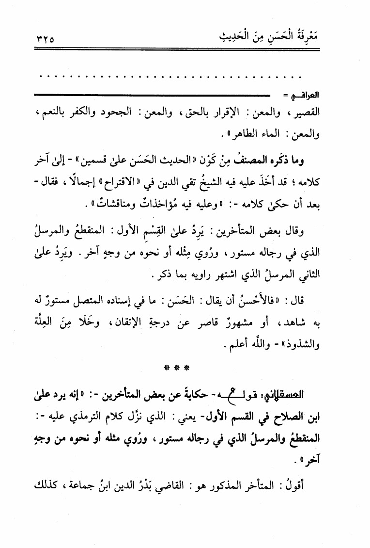 نام کتاب : علوم الحديث لابن الصلاح ونكت الحافظ العراقي المسماة بالتقييد والإيضاح لما أطلق وأغلق من كتاب ابن الصلاح ونكت الحافظ العسقلاني المسماة بالإفصاح بتكميل النكت على ابن الصلاح (ت: عوض الله) نویسنده : ابن الصلاح - العراقي - ابن حجر جلد : 1 صفحه : 325