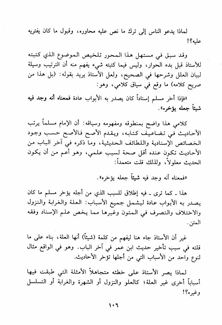نام کتاب : ما هكذا تورد يا سعد الإبل حوار علمي مع الدكتور ربيع حول منهج المحدثين النقاد القدامى في نقد الأحاديث - صحيح مسلم أنموذجا نویسنده : حمزة عبد الله المليباري جلد : 1 صفحه : 106