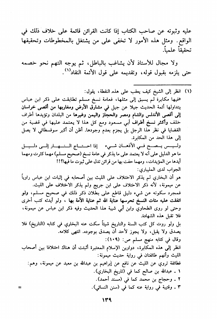 نام کتاب : ما هكذا تورد يا سعد الإبل حوار علمي مع الدكتور ربيع حول منهج المحدثين النقاد القدامى في نقد الأحاديث - صحيح مسلم أنموذجا نویسنده : حمزة عبد الله المليباري جلد : 1 صفحه : 139