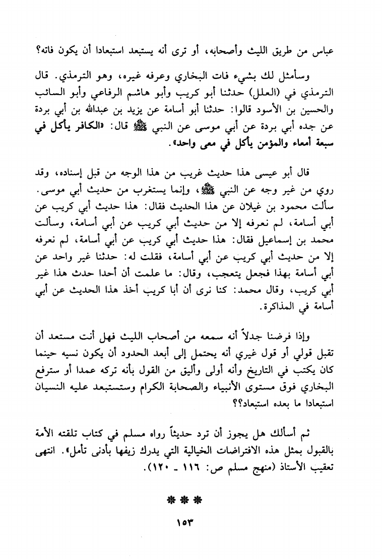 نام کتاب : ما هكذا تورد يا سعد الإبل حوار علمي مع الدكتور ربيع حول منهج المحدثين النقاد القدامى في نقد الأحاديث - صحيح مسلم أنموذجا نویسنده : حمزة عبد الله المليباري جلد : 1 صفحه : 153