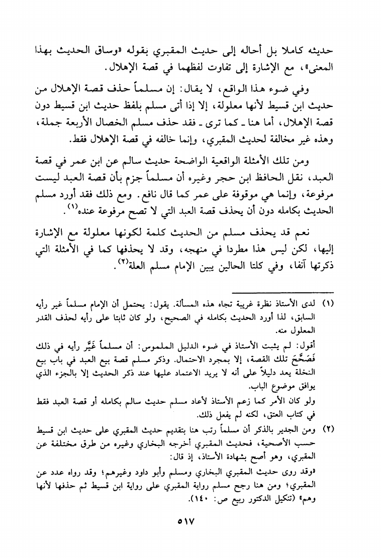 نام کتاب : ما هكذا تورد يا سعد الإبل حوار علمي مع الدكتور ربيع حول منهج المحدثين النقاد القدامى في نقد الأحاديث - صحيح مسلم أنموذجا نویسنده : حمزة عبد الله المليباري جلد : 1 صفحه : 517
