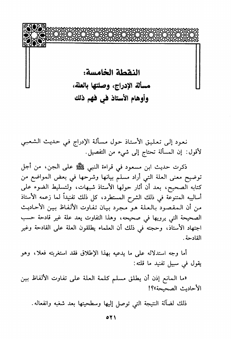 نام کتاب : ما هكذا تورد يا سعد الإبل حوار علمي مع الدكتور ربيع حول منهج المحدثين النقاد القدامى في نقد الأحاديث - صحيح مسلم أنموذجا نویسنده : حمزة عبد الله المليباري جلد : 1 صفحه : 521
