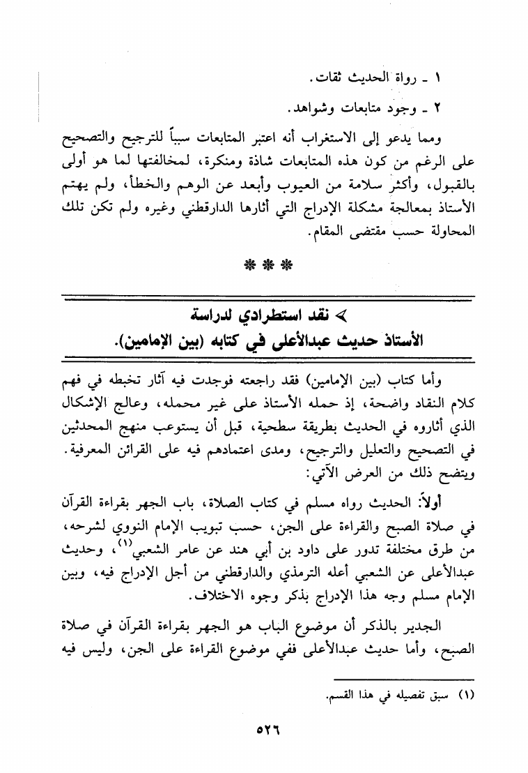 نام کتاب : ما هكذا تورد يا سعد الإبل حوار علمي مع الدكتور ربيع حول منهج المحدثين النقاد القدامى في نقد الأحاديث - صحيح مسلم أنموذجا نویسنده : حمزة عبد الله المليباري جلد : 1 صفحه : 526