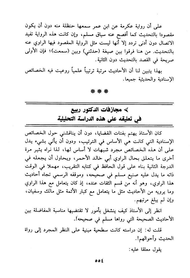 نام کتاب : ما هكذا تورد يا سعد الإبل حوار علمي مع الدكتور ربيع حول منهج المحدثين النقاد القدامى في نقد الأحاديث - صحيح مسلم أنموذجا نویسنده : حمزة عبد الله المليباري جلد : 1 صفحه : 554
