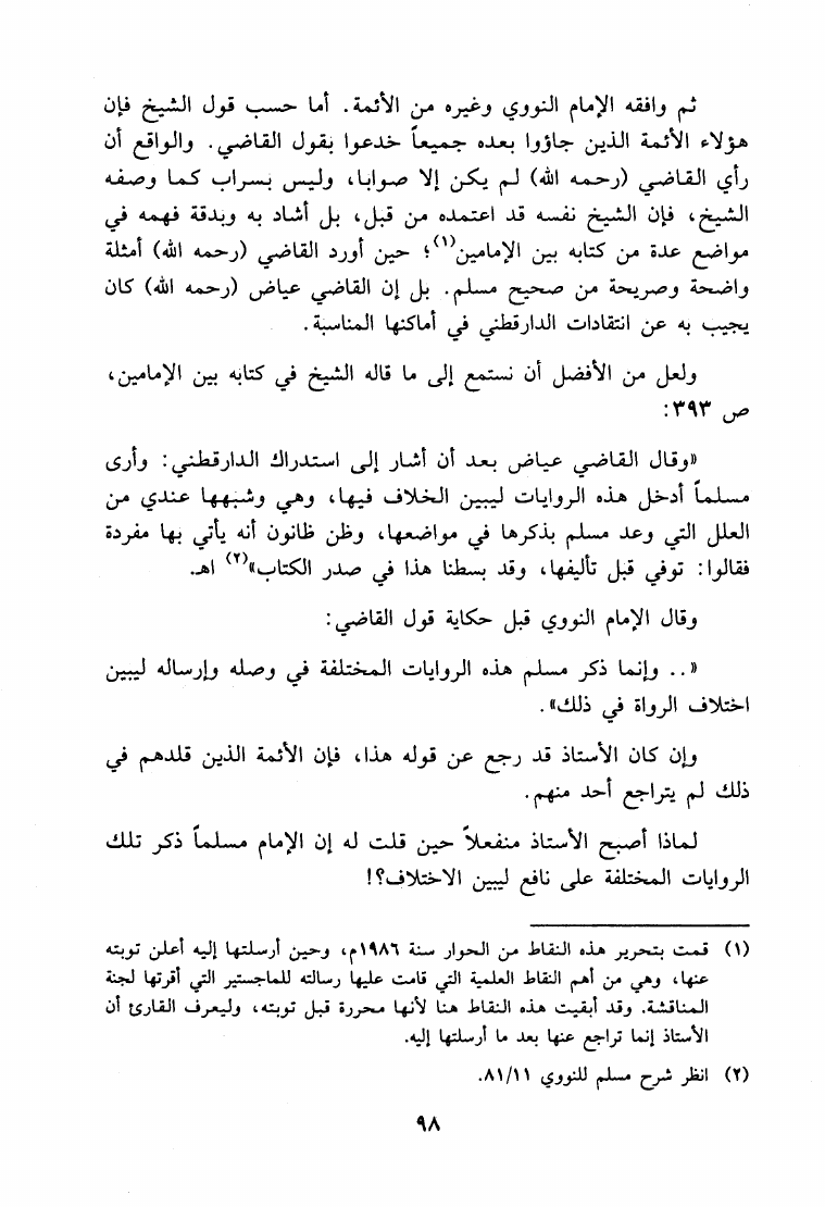 نام کتاب : ما هكذا تورد يا سعد الإبل حوار علمي مع الدكتور ربيع حول منهج المحدثين النقاد القدامى في نقد الأحاديث - صحيح مسلم أنموذجا نویسنده : حمزة عبد الله المليباري جلد : 1 صفحه : 98