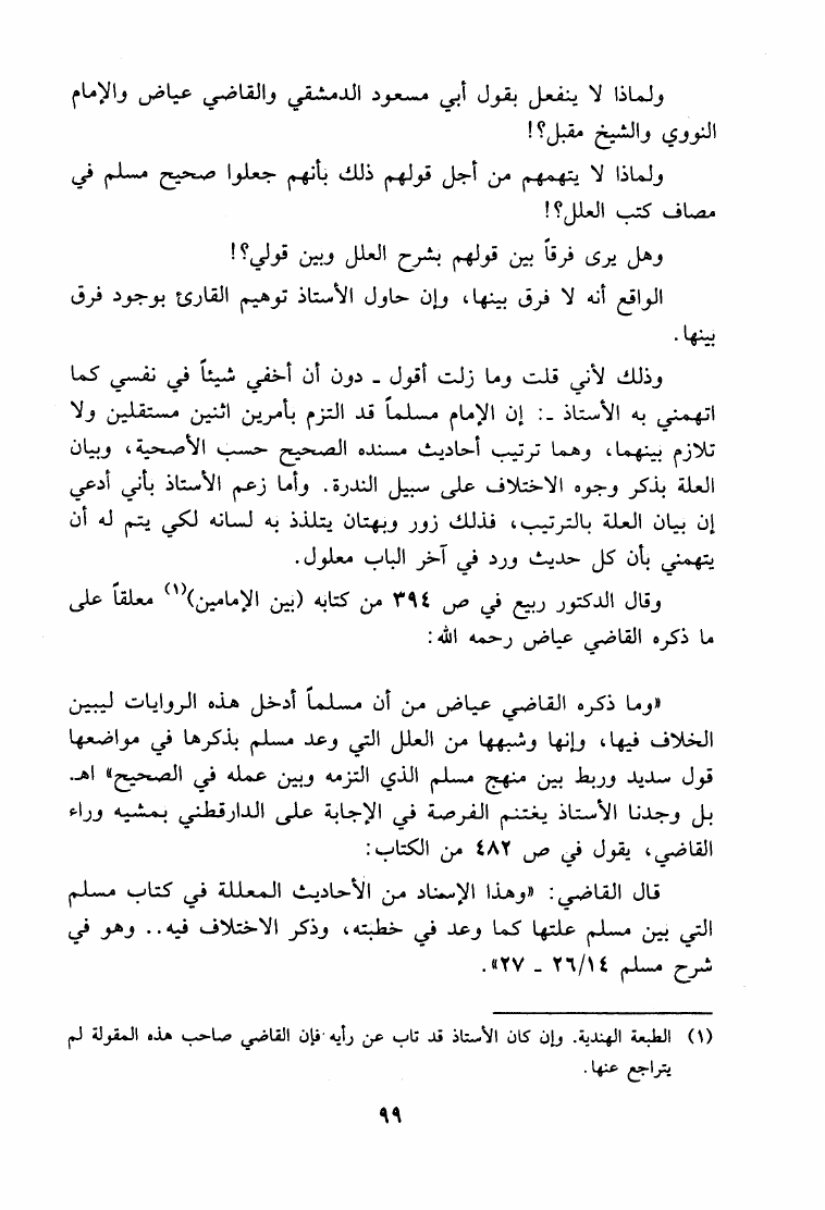 نام کتاب : ما هكذا تورد يا سعد الإبل حوار علمي مع الدكتور ربيع حول منهج المحدثين النقاد القدامى في نقد الأحاديث - صحيح مسلم أنموذجا نویسنده : حمزة عبد الله المليباري جلد : 1 صفحه : 99