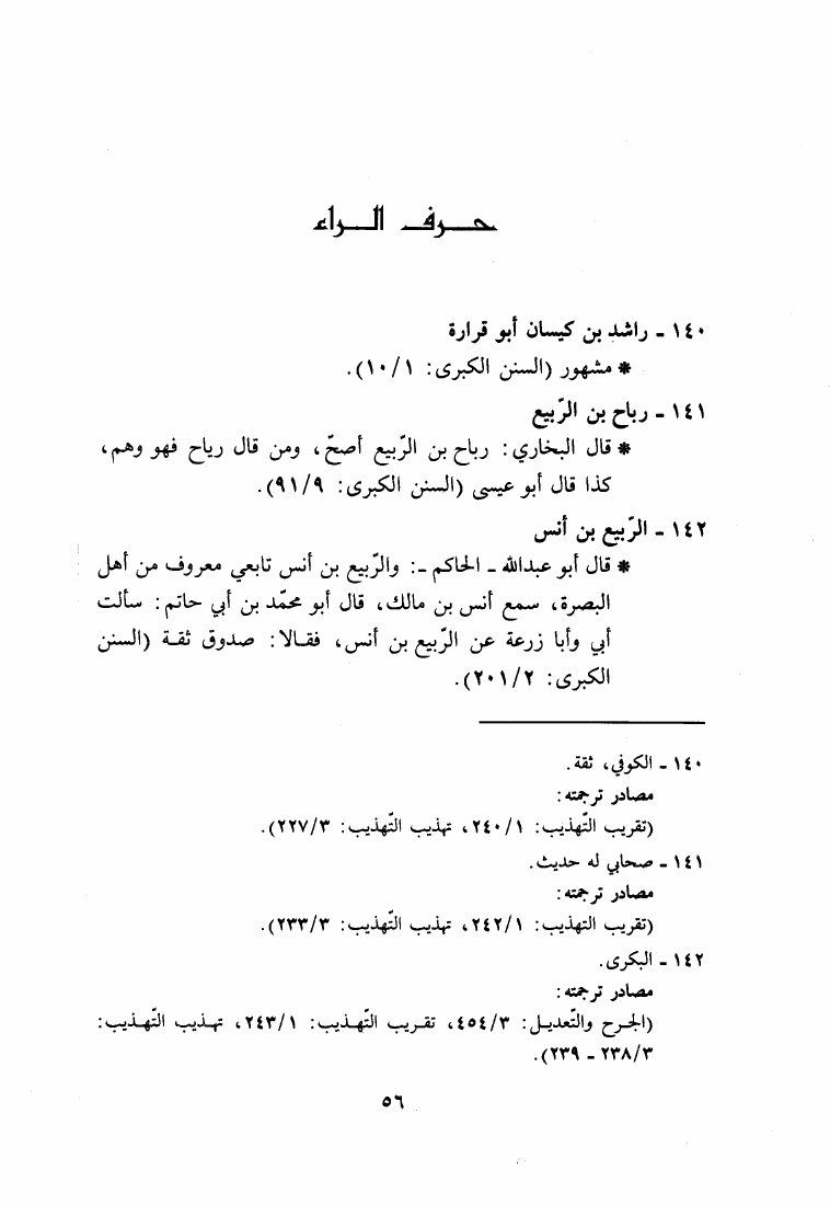 نام کتاب : معجم الجرح والتعديل لرجال السنن الكبرى مع دراسة إضافية لمنهج البيهقي في نقد الرواة في ضوء السنن الكبرى نویسنده : نجم عبد الرحمن خلف جلد : 1 صفحه : 56