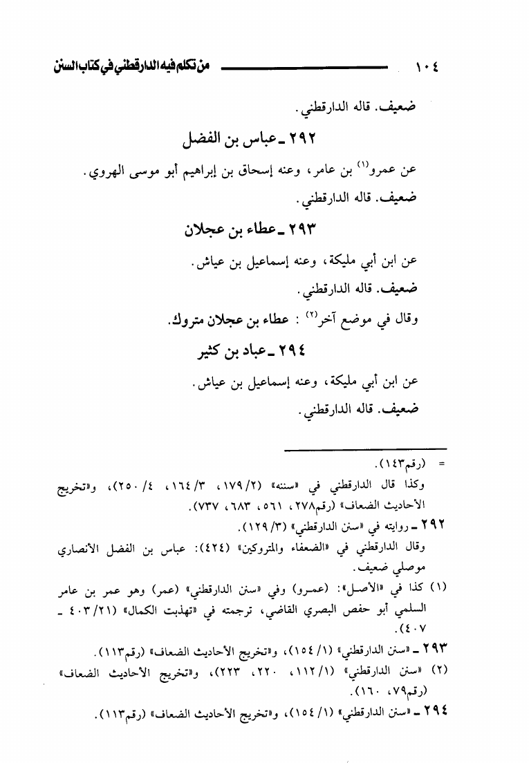 نام کتاب : من تكلم فيه الدارقطني في كتاب السنن من الضعفاء والمتروكين والمجهولين (ط. أوقاف قطر) نویسنده : محمد بن عبد الرحمن بن محمد ابن زريق جلد : 1 صفحه : 104