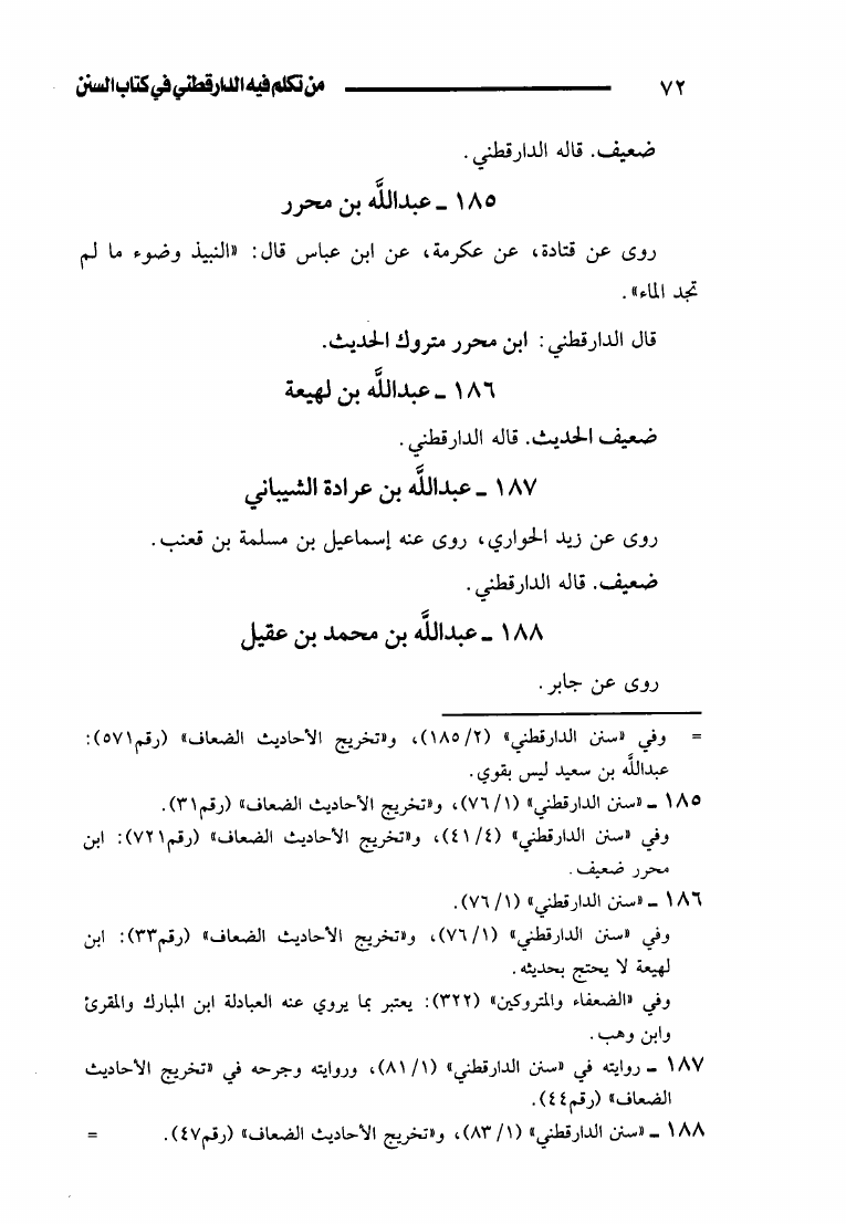 نام کتاب : من تكلم فيه الدارقطني في كتاب السنن من الضعفاء والمتروكين والمجهولين (ط. أوقاف قطر) نویسنده : محمد بن عبد الرحمن بن محمد ابن زريق جلد : 1 صفحه : 72