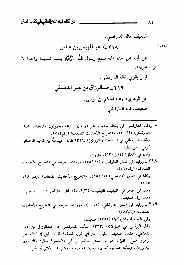 نام کتاب : من تكلم فيه الدارقطني في كتاب السنن من الضعفاء والمتروكين والمجهولين (ط. أوقاف قطر) نویسنده : محمد بن عبد الرحمن بن محمد ابن زريق جلد : 1 صفحه : 82