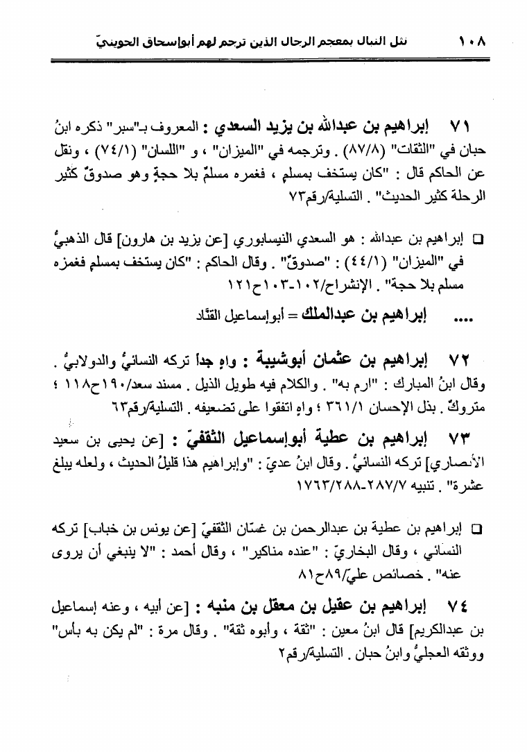 نام کتاب : نثل النبال بمعجم الرجال الذين ترجم لهم فضيلة الشيخ المحدث أبو إسحاق الحويني (ط. المحدثين) نویسنده : أحمد بن عطية الوكيل أبو عمرو جلد : 1 صفحه : 108