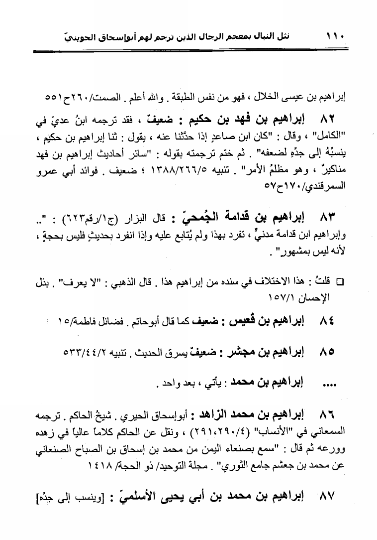 نام کتاب : نثل النبال بمعجم الرجال الذين ترجم لهم فضيلة الشيخ المحدث أبو إسحاق الحويني (ط. المحدثين) نویسنده : أحمد بن عطية الوكيل أبو عمرو جلد : 1 صفحه : 110