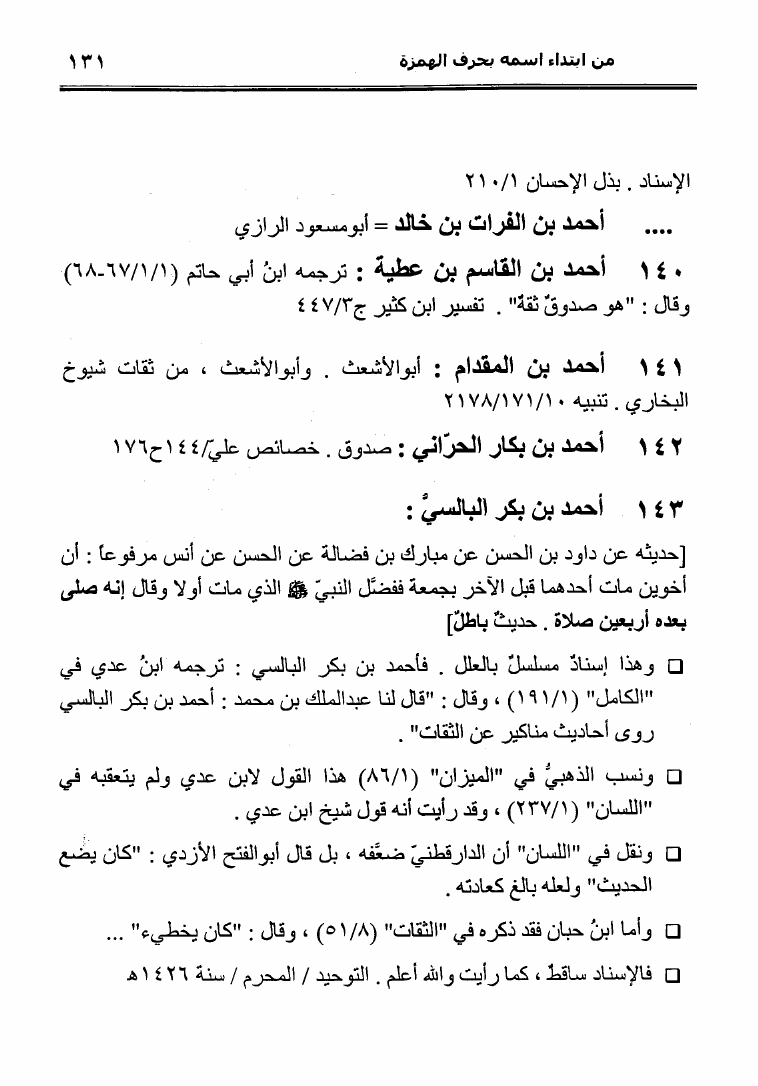 نام کتاب : نثل النبال بمعجم الرجال الذين ترجم لهم فضيلة الشيخ المحدث أبو إسحاق الحويني (ط. المحدثين) نویسنده : أحمد بن عطية الوكيل أبو عمرو جلد : 1 صفحه : 131