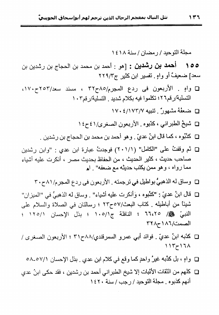 نام کتاب : نثل النبال بمعجم الرجال الذين ترجم لهم فضيلة الشيخ المحدث أبو إسحاق الحويني (ط. المحدثين) نویسنده : أحمد بن عطية الوكيل أبو عمرو جلد : 1 صفحه : 136