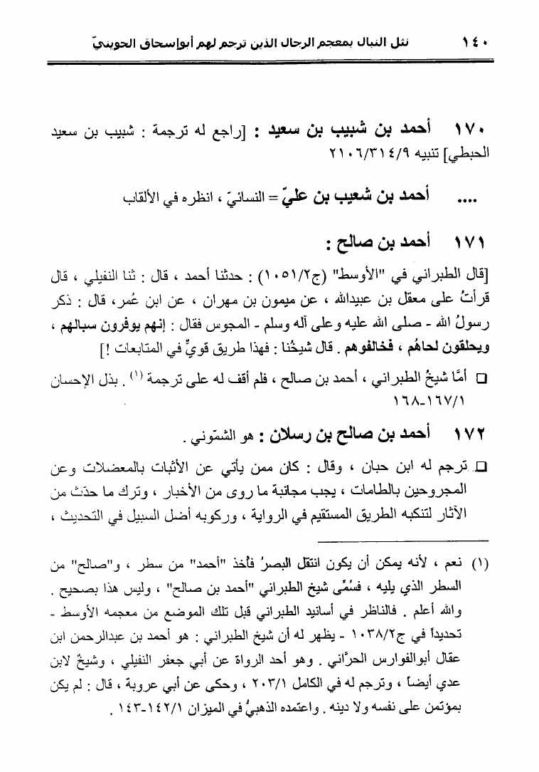 نام کتاب : نثل النبال بمعجم الرجال الذين ترجم لهم فضيلة الشيخ المحدث أبو إسحاق الحويني (ط. المحدثين) نویسنده : أحمد بن عطية الوكيل أبو عمرو جلد : 1 صفحه : 140