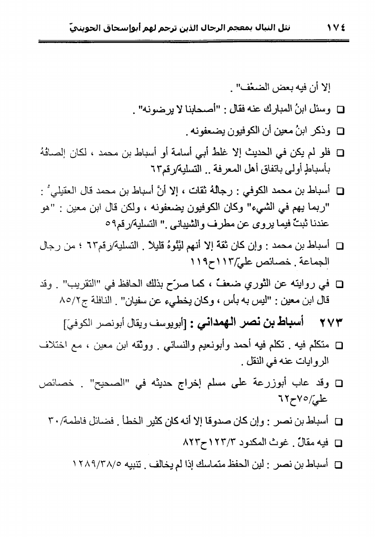 نام کتاب : نثل النبال بمعجم الرجال الذين ترجم لهم فضيلة الشيخ المحدث أبو إسحاق الحويني (ط. المحدثين) نویسنده : أحمد بن عطية الوكيل أبو عمرو جلد : 1 صفحه : 174