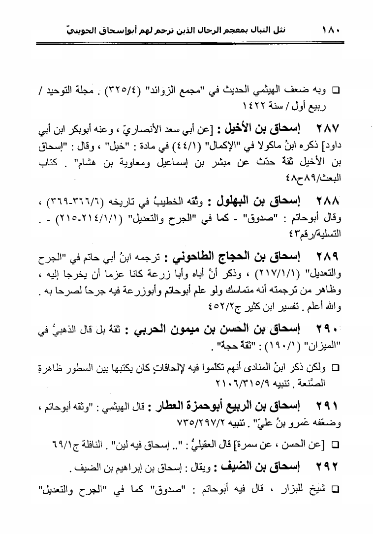 نام کتاب : نثل النبال بمعجم الرجال الذين ترجم لهم فضيلة الشيخ المحدث أبو إسحاق الحويني (ط. المحدثين) نویسنده : أحمد بن عطية الوكيل أبو عمرو جلد : 1 صفحه : 180