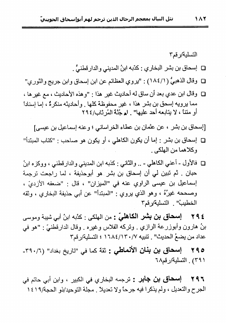 نام کتاب : نثل النبال بمعجم الرجال الذين ترجم لهم فضيلة الشيخ المحدث أبو إسحاق الحويني (ط. المحدثين) نویسنده : أحمد بن عطية الوكيل أبو عمرو جلد : 1 صفحه : 182