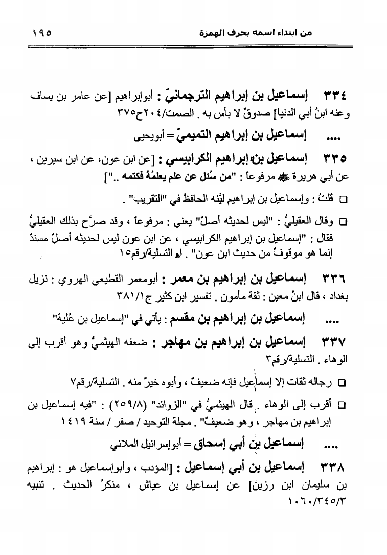 نام کتاب : نثل النبال بمعجم الرجال الذين ترجم لهم فضيلة الشيخ المحدث أبو إسحاق الحويني (ط. المحدثين) نویسنده : أحمد بن عطية الوكيل أبو عمرو جلد : 1 صفحه : 195