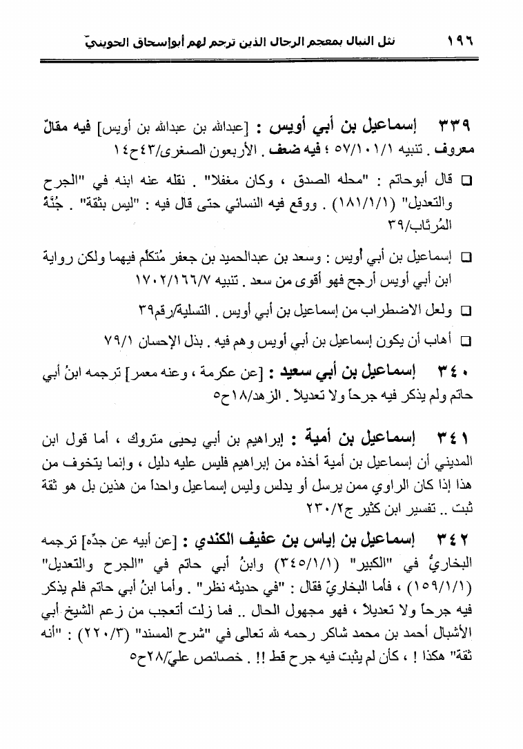 نام کتاب : نثل النبال بمعجم الرجال الذين ترجم لهم فضيلة الشيخ المحدث أبو إسحاق الحويني (ط. المحدثين) نویسنده : أحمد بن عطية الوكيل أبو عمرو جلد : 1 صفحه : 196