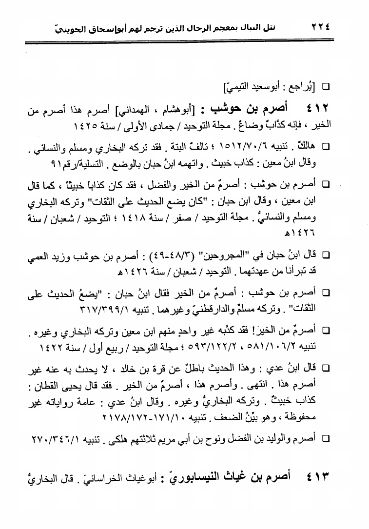 نام کتاب : نثل النبال بمعجم الرجال الذين ترجم لهم فضيلة الشيخ المحدث أبو إسحاق الحويني (ط. المحدثين) نویسنده : أحمد بن عطية الوكيل أبو عمرو جلد : 1 صفحه : 224