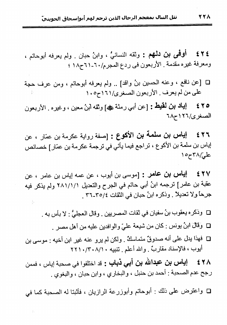نام کتاب : نثل النبال بمعجم الرجال الذين ترجم لهم فضيلة الشيخ المحدث أبو إسحاق الحويني (ط. المحدثين) نویسنده : أحمد بن عطية الوكيل أبو عمرو جلد : 1 صفحه : 228
