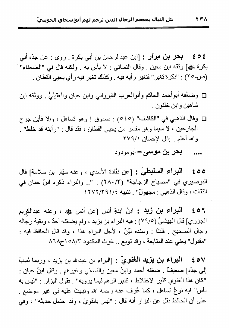 نام کتاب : نثل النبال بمعجم الرجال الذين ترجم لهم فضيلة الشيخ المحدث أبو إسحاق الحويني (ط. المحدثين) نویسنده : أحمد بن عطية الوكيل أبو عمرو جلد : 1 صفحه : 238