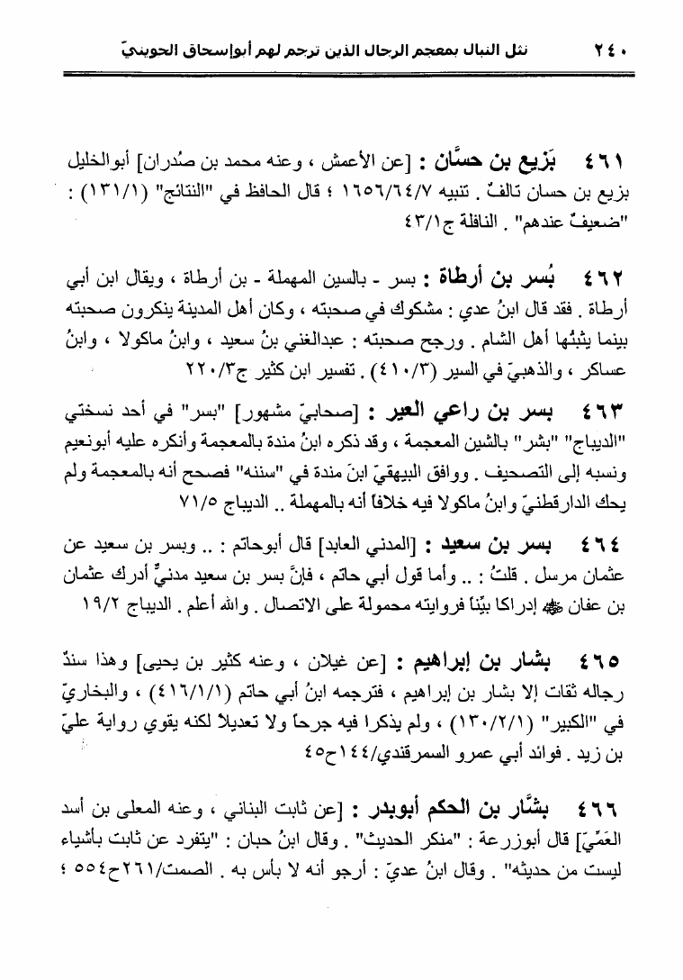 نام کتاب : نثل النبال بمعجم الرجال الذين ترجم لهم فضيلة الشيخ المحدث أبو إسحاق الحويني (ط. المحدثين) نویسنده : أحمد بن عطية الوكيل أبو عمرو جلد : 1 صفحه : 240